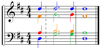 Here is the original version of the last 2 bars of Handel's Alleluia, with Substitution1(3) on both TONIC and COUNTER chords D \ G, G / D, Real Triads in Root Position, with note-values \ . , / .