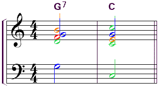 1. The most typical and best-known Tetrad is the DOMINANT Seventh, - the chord of V, in this case, G7, producing a flattening progression ("downward") - with a FRAME composed of two members of the Series of Fifths, G (the COMMON TONE ) and D (the PROPER TONE) - the