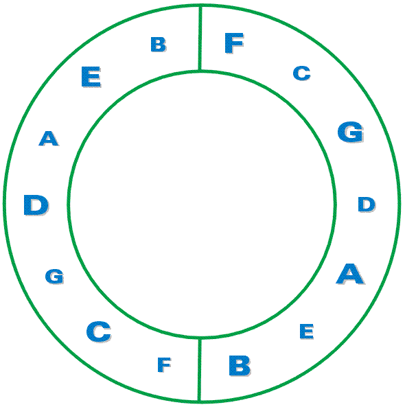 Diatonic scales can be generated by taking the opposite procedure to the one taken for triads. Instead of “dividing” each fifth in two, we shall “multiply” and take every second fifth, (indicated as a larger note), in 2 Windows placed, end to end, in a circle. We have the ratio 9/8 of 2 fifths for all our major seconds (tones). It is interesting to note that the 2 minor seconds (semi-tones), E-F and B-C, are placed across the lines where we move into a new window.